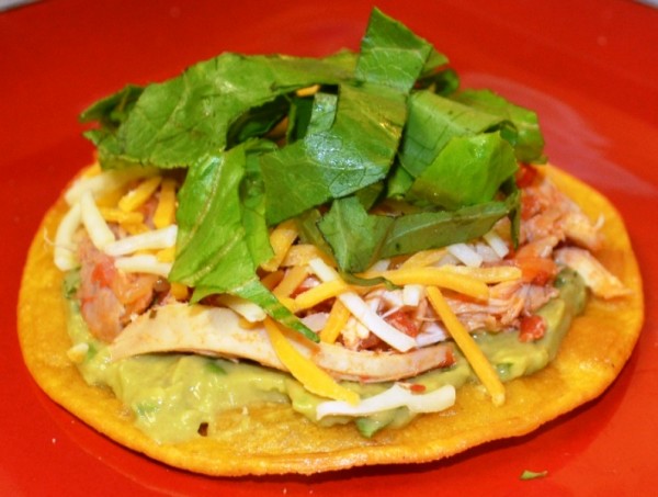 - Spread the avocado mixture on the tortilla. top that with the chicken, tomato and onion mix. Sprinkle with cheese and the Romaine lettuce.